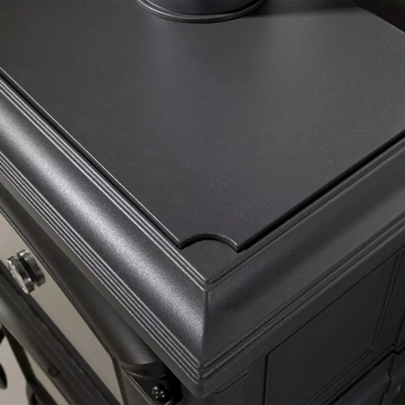 Son atout majeur est son four intégré de 39 litres en acier émaillé porcelainé, doté d'un intérieur en pierre lavique pour une cuisson authentique. Avec un rendement remarquable de 87,7 % et une consommation de bois optimisée (2,6 kg/h), il est classé A+ et répond aux normes Flamme Verte 7 étoiles.