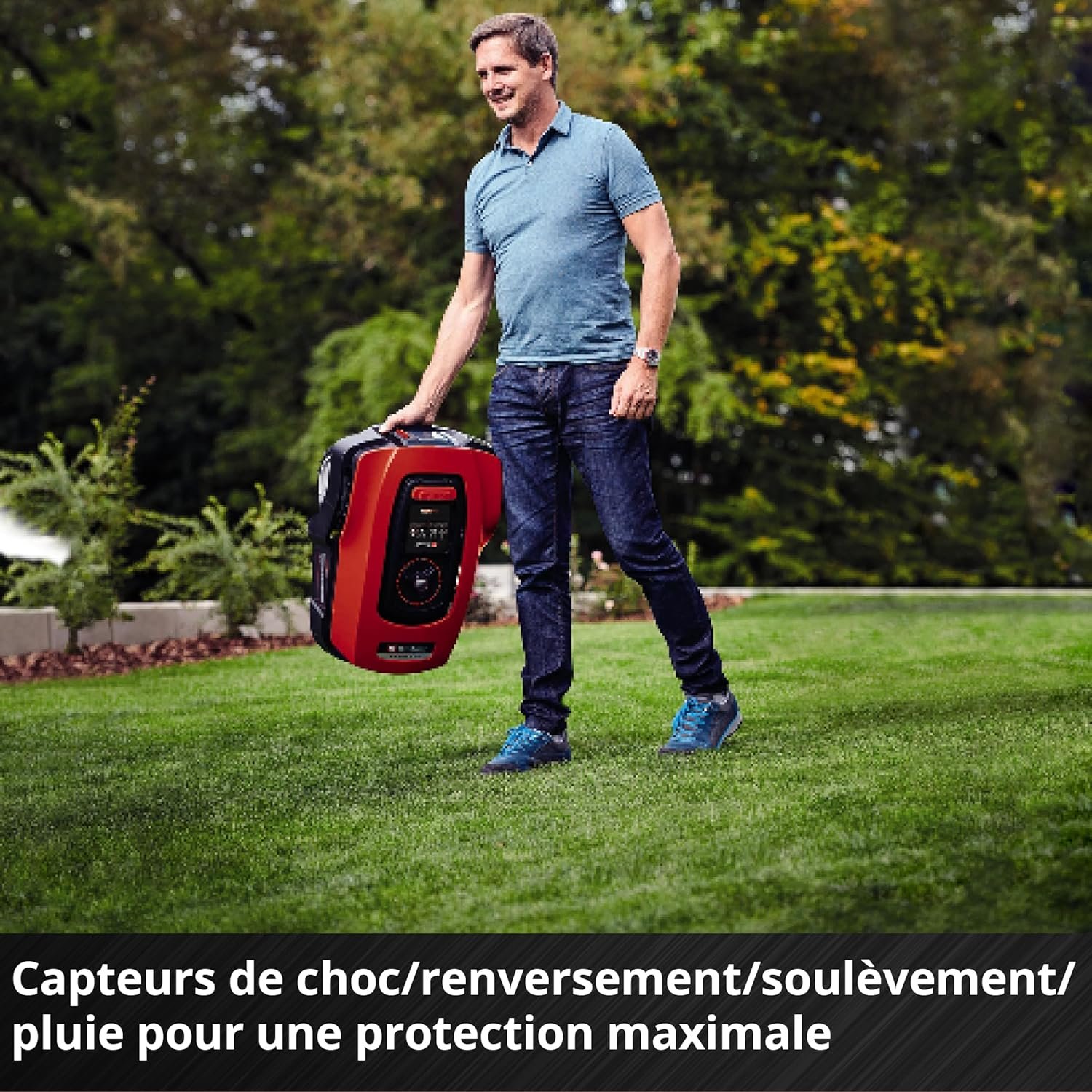Doté d'un mode multizones pour les jardins aux formes complexes et de capteurs de sécurité (choc, renversement, pluie) pour une tonte autonome et sûre.