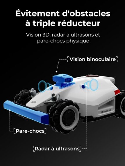Conçu pour des surfaces jusqu'à 600 m², il intègre une caméra 4K qui détecte et évite les obstacles en temps réel (jouets, animaux, mobilier). Sa capacité d'apprentissage continu lui permet de s'adapter aux évolutions de votre jardin.